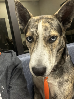 she is brindle with black on her back and bright blue eyes