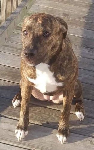 | Brown and tan tiger brindle, white chest, four white paws |
