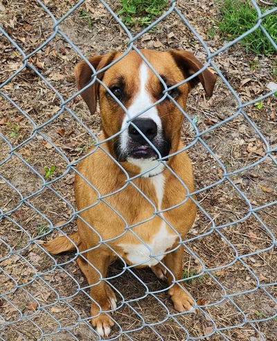 | This furbaby is a neutered male I believe...he is some sort of boxer bulldog mix...he is very nice and affectionate...he has white markings on his head, neck, and chest...he is light brown overall...he has a mid- size tail... |