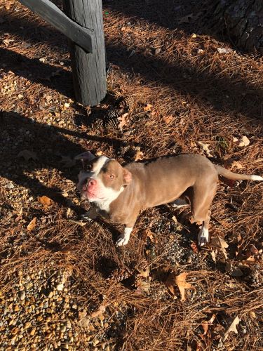 Description: | Brown and white female pit bull mix. Body is brown, paws and head are white. Brown spot over left eye and ear. Brown spot over right eye. |