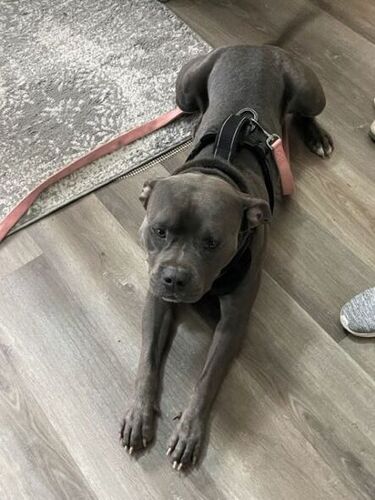 Male, intact pit bull, grey in color.