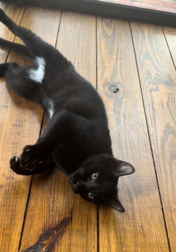 Description: | I found this small black cat (possibly a kitten) outside in my backyard. It’s very affectionate, sweet, and loves to be cuddled. It has yellow/greenish eyes and some white splotches on it’s stomach. |