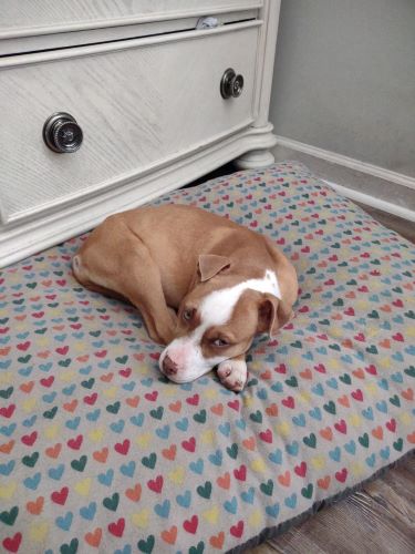 Description: | The puppy has a scar under left eye. Ears look to be either chewed or damaged from weather. Ribs showing and swollen stomach. |