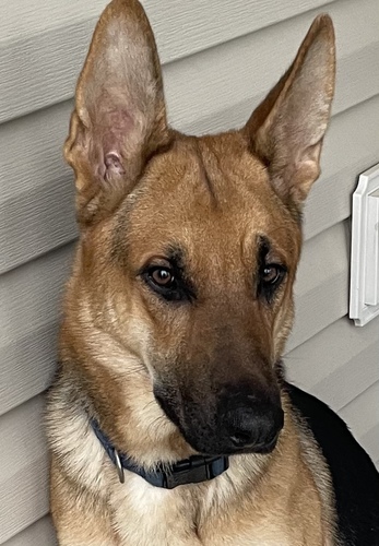 Description: | German shepherd, possibly mixed with something else? He is not neutered and has a small bend at the tip of his tail. |