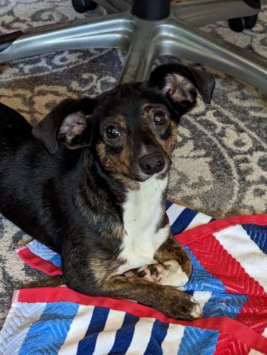 A small mixed breed, possibly Dachshund. She has a severe overbite and big floppy ears.