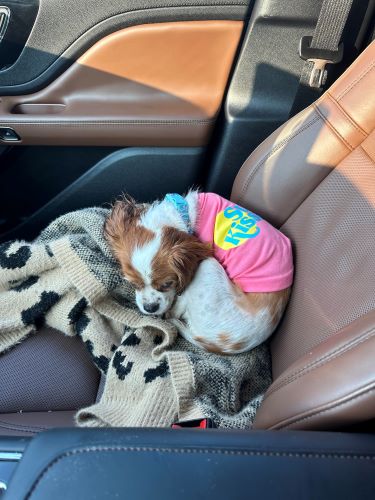 Description: | Small female dog with a pink shirt and blue collar with a bow. I believe she is a Cavalier Spaniel or a mix with Cavalier Spaniel. Very thin and maybe have had some skin issues. Her hair is patchy in most of her body except her face. |