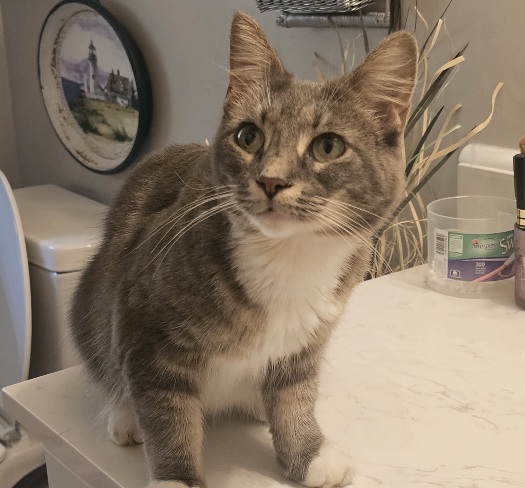 Description: | Grey medium/long haired cat with white paws. Cat is very friendly and seems like a house cat and well taken care of. |