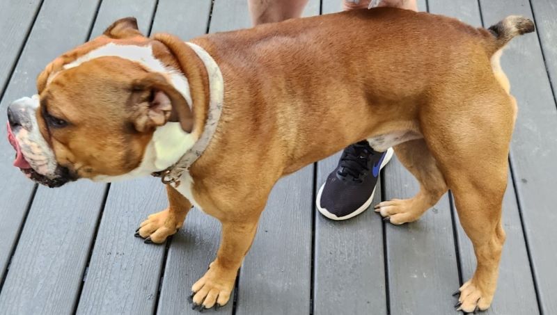 Description: | Small male bulldog, tan with white face and some white around the neck. Short black tail with a lighter color stripe around the tail. Small terrier-type dog, yellowish color mixed with darker and lighter colors, black muzzle and dark/black ears. |