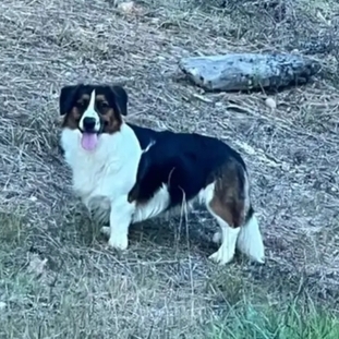 Description: | Looks like a boarder collie or English shepherd. White legs and belly with a white snout, black back and brown markings on back and face. Brown eyes |
