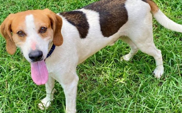 Description: | White dog with black and brown markings. Appears to be a hunting/walker/hound type breed. Medium size. Very friendly. Appears to be young. |