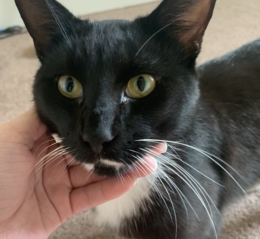 Description: | This cat is a sweetheart. He is black and white. The white marks under his mouth and chin look like vampire teeth. |