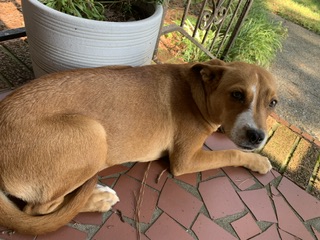 Description: | she is a knee-high dog with wiry red brown fur. She has big pointy ears and a black nose. Extremely skittish, she has some white markings on her and a skinny tail. |