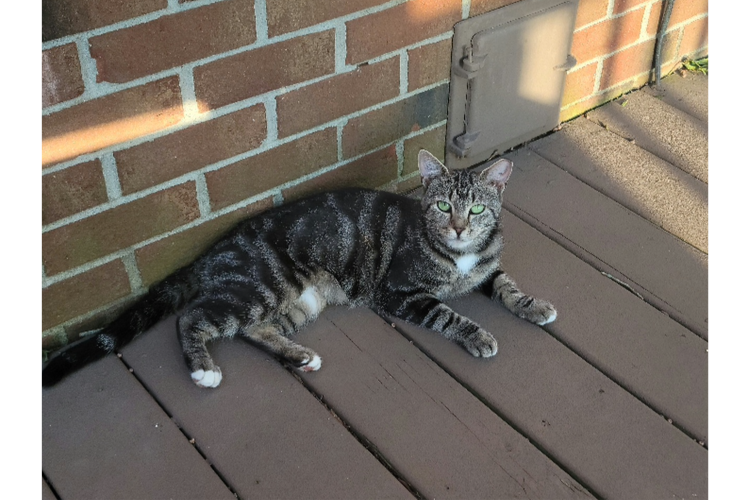 Young, Gray and black tabby with white underneath. Green eyes.