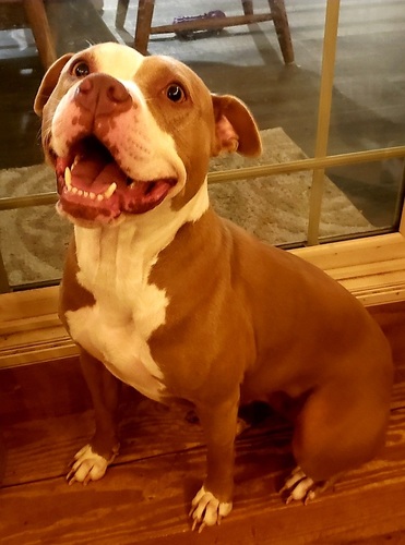 Female tan and white pit mix. White on face, feet, and tip of tail.