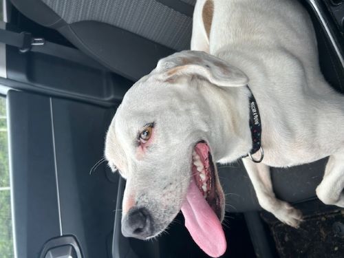 Description: | Small pit mix it looks like. All white with small brown marks. Does have a patterned collar on, but no tags. |