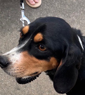 Black brown possibly Beagle mix. Female.