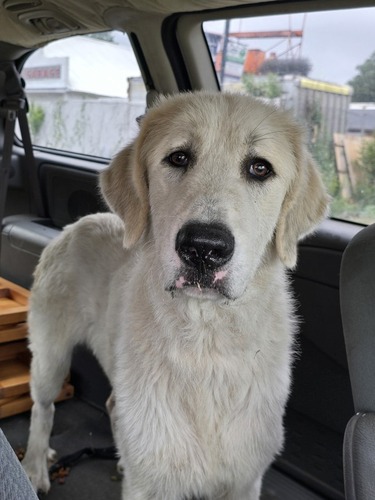 Description: | A Great Pyrenees or some type of mix of that with some type of sheepdog Maybe White with some goldish brown markings not neutered and not microchipped |