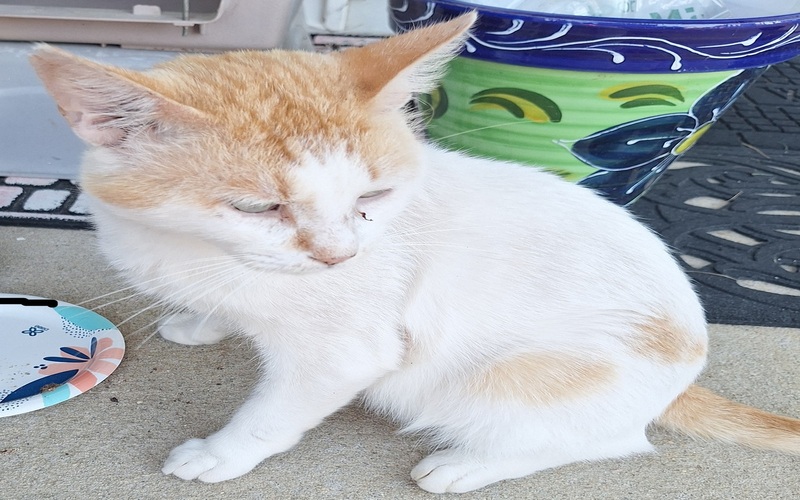 Description: | This is a male cat who has not been neutered. He has white hair with patches of light orange color on his head and a few on his hindquarters. He has yellowish-green eyes and a striped tail. He is very sweet and friendly, so I believe he is someone's pet who has escaped or gotten lost. |