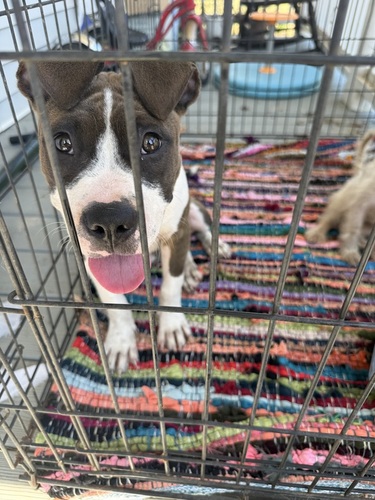 Female pit bull puppy, brown and white, long tail