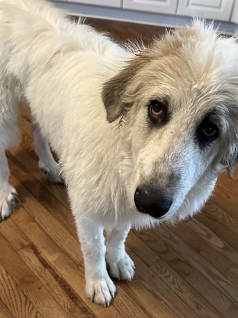 Description: | Great Pyrenees found in Smithfield,NC. Male white dog with tan ears. Friendly and prefers indoors. Very thin in weight ,although toe nails appear groomed. No chip found per local vet. |