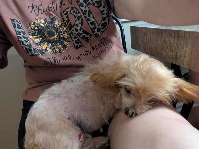 Patient has lost hair, cut knee cap, bad eyes and ear infection.